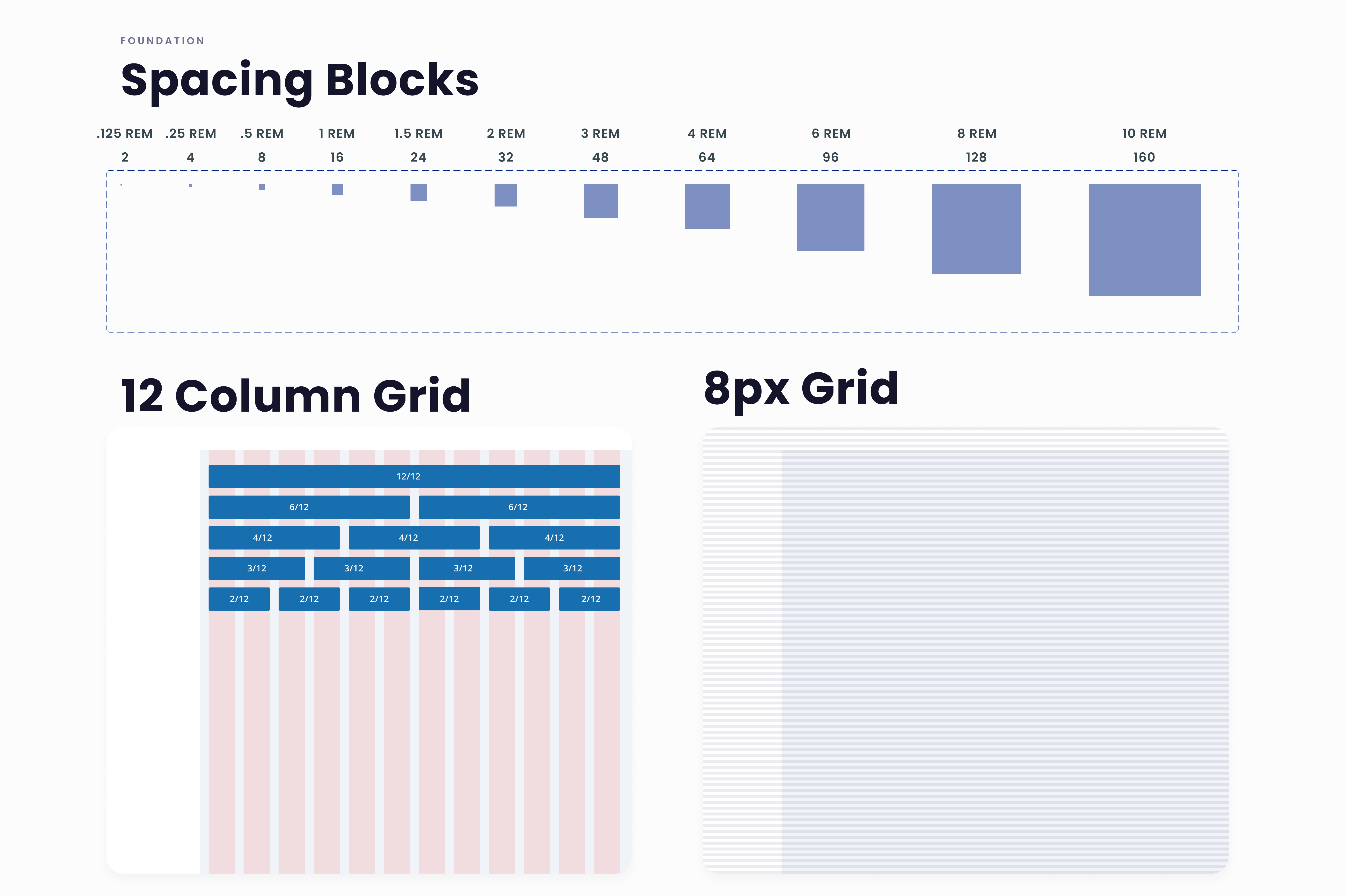 The foundation of a design system is spacing and grid system. For this project I went with an 8pt grid system that consists of a 12 column grid and an 8px baseline grid, enhancing responsiveness for all major screen sizes and preventing anti-aliasing issues.![]()