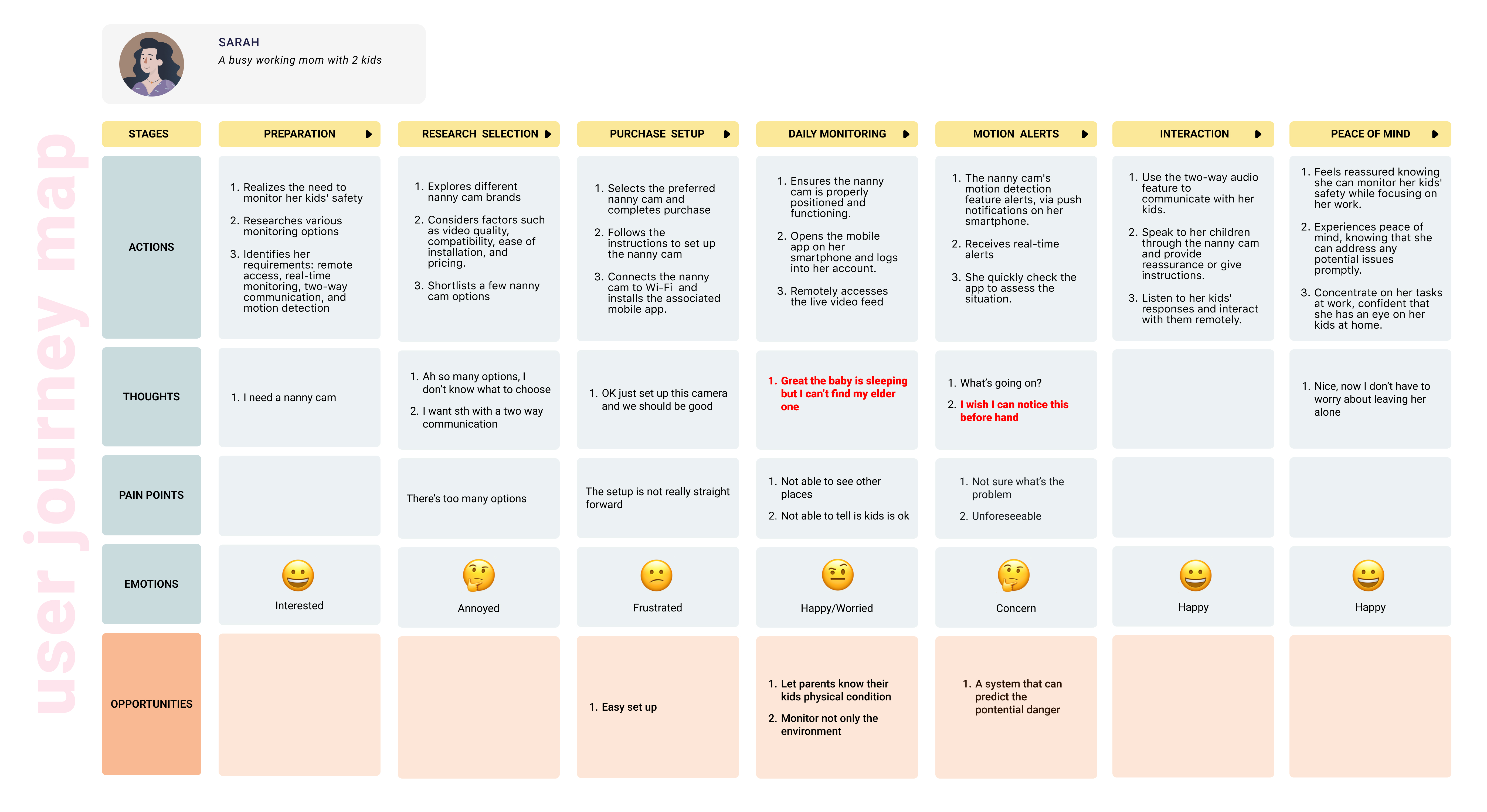 To begin with, I research the pain points of kids monitoring and use them to create three personas and journey map. Then, I physically act out the story using the journey map. This method allows me to deeply consider the potential users' situations and surroundings, helping me understand their needs and challenges in detail.