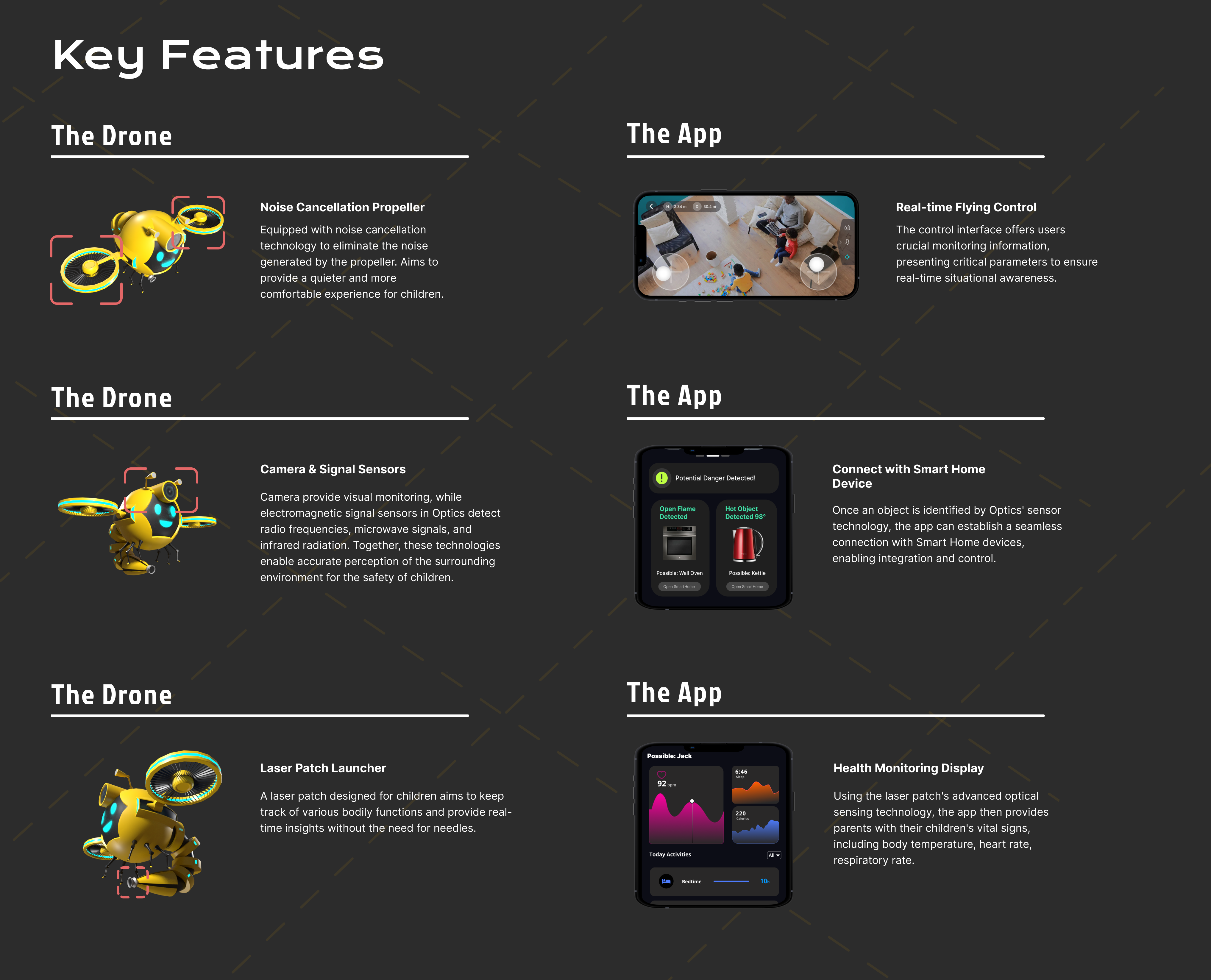 Camera: With added sensors, Optics technology enhances users' perception beyond the human eye, detecting temperature variations and identifying potential hazards. The camera's capabilities, coupled with the laser patch, enable parents to monitor their children's vital signs. Additionally, the flying function offers a wider perspective for monitoring larger areas and capturing unique viewpoints.